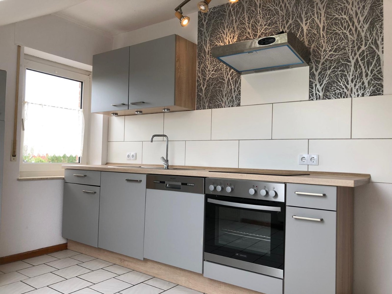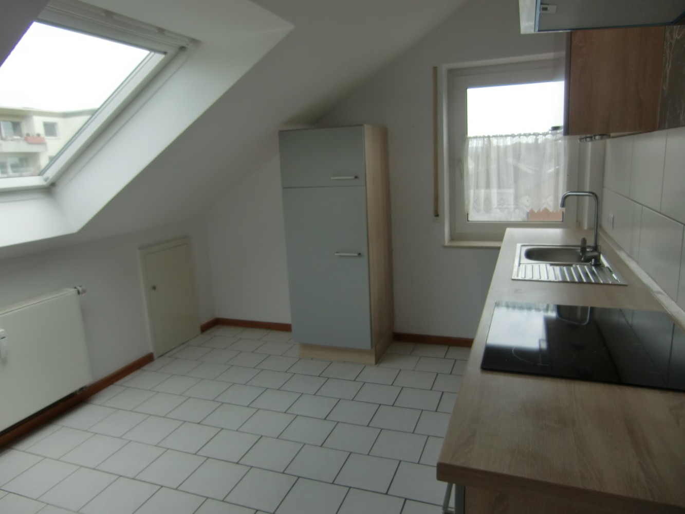 Die Küche ist modernisiert und mit einer zeitgemäßen Einbauküche ausgestattet (kann mit erworben werden). Helle Fliesen, viel Tageslicht – sowohl durch das Fenster als auch durch ein großes Dachflächenfenster – und eine klare Linienführung sorgen für eine sachliche, angenehme Atmosphäre. Der Platz reicht aus, um zusätzlich einen kleinen Essbereich einzurichten.