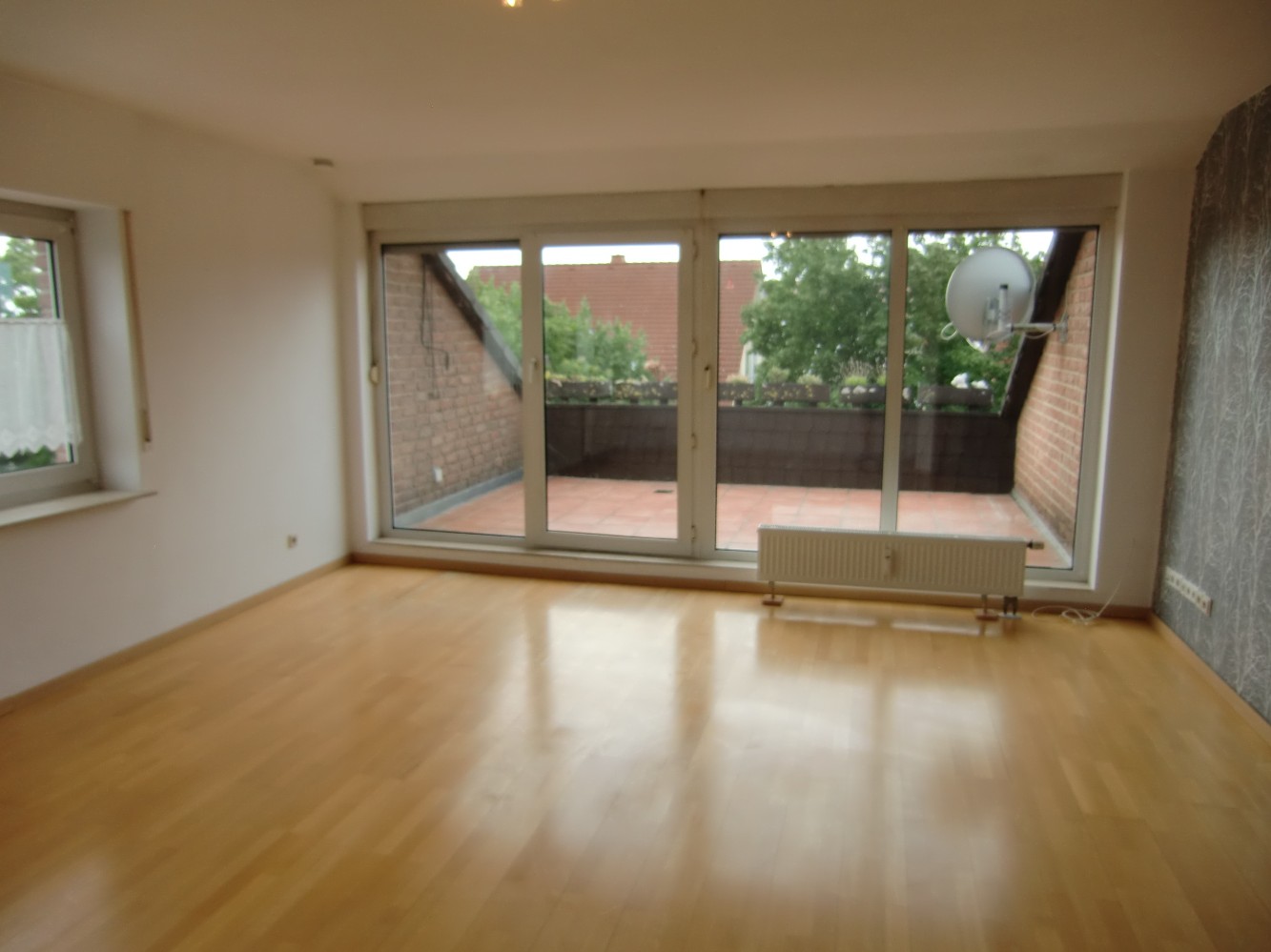 Das Wohnzimmer wirkt durch die große Fensterfront sehr freundlich und bietet einen direkten Blick auf die Loggia. Der Boden ist gepflegt, und der Raum lässt sich gut möblieren.