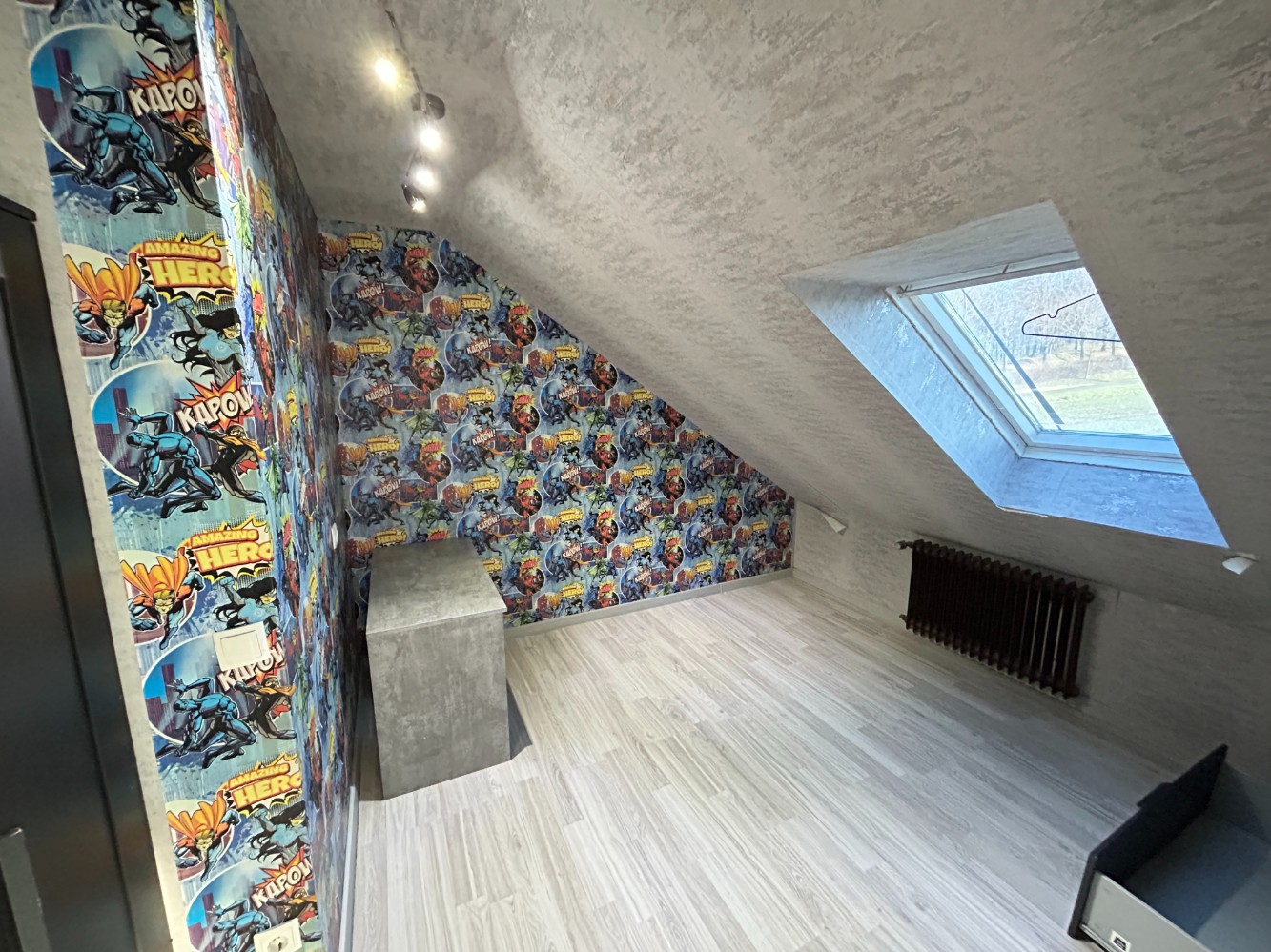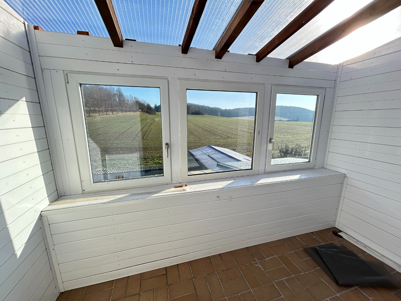 Das vollständig ausgebaute Dachgeschoss stellt eine eigenständige und sehr gut nutzbare Wohnebene dar. Hier befinden sich ein Wohnzimmer mit Zugang zum Wintergarten, zwei weitere Zimmer, die sich ideal als Kinder-, Arbeits- oder Gästezimmer eignen, sowie ein praktischer Ankleide- bzw. Abstellraum in der Dachschräge. Darüber hinaus steht im Dachgeschoss ein Badezimmer mit Badewanne zur Verfügung. Der Wintergarten bietet einen offenen Blick in die umliegende Landschaft und unterstreicht die besondere Lage des Hauses.